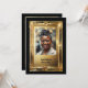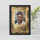 An elegant bold gold frame appears to shimmer and shine against a black background that has a photo template on it for a photograph of your employee. Below it is a font for your custom wording. The back has the same golden border with bold black templates that may be personalized to suit your requirements. This design is suited to a farewell business luncheon or a retirement party.