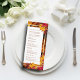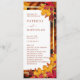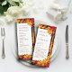 Guide your guests through your special day with our exquisite wedding program. This captivating design features a rustic backdrop of autumn leaves, complemented by a shorter, elegant white panel adorned with a shimmering gold frame and surrounded by autumn foliage. The couple's names are prominently displayed in bold typography, followed by the wedding date and venue location.