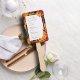 Add a touch of elegance and functionality to your wedding day with our exquisite hand fan program. This captivating design features a rustic backdrop of autumn leaves, creating a warm and inviting atmosphere. A shorter, white panel adorned with a shimmering gold frame and surrounded by autumn foliage provides a sophisticated frame for your wedding details.