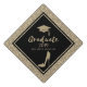 Elegant gold glitter graduate cap, high heels on black and gold glitter background .