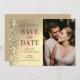 Elegant Gold Glitter Photo Wedding Save The Date Invitation Invite features an elegant brown script on a gold glitter background with your favorite photo. Perfect for weddings, birthday, anniversary, Bat Mitzvah, baby showers, parties and celebrations. Designed for you by © Evco Studio at www.zazzle.com/store/evcostudio