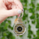 This personalized keychain features a customizable gold monogram in a black frame on a faux gold glitter, black and white striped background.