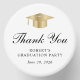 Elegant graduation party mini candle favors featuring a gold grad cap, "Thank You" in a calligraphy script, and the graduate's name and party date in classic serif typography.