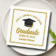 This elegant gold graduation party paper napkin features your high school or college graduate name and school in chic, bold typography surrounding a modern black grad cap. Great custom party decor for the senior class.