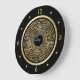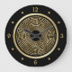 This elegant wall clock features a center Greek key pattern which gives an abstract feel to the design. A gold circle frame separates the pattern from the numbers and diamonds which help make the clock easy to read. Everything is placed on a dramatic black background.