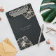 Island chic personalized clipboard features two lines of custom text in classic white lettering, on a soft black background adorned with a tropical hibiscus flower illustration in faux gold foil. Reverse side shows a variation on the design with a smaller flower and your custom text. Please note that this clipboard is a mini size; full size version also available in our Hibiscus collection.