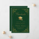 Send your family and friends this elegant graduation announcement card to wow them. This design features faux gold grad cap and script on a green background framed with a faux gold filigree botanical border. Personalize with your own details, name, school and year. Designed by Susan Coffey.