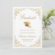 Send your family and friends this elegant graduation announcement card to wow them. This design features faux gold grad cap and script on a white background framed with a faux gold filigree botanical border. Personalize with your own details, name, school and year. Designed by Susan Coffey.