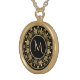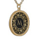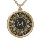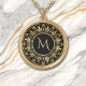 This elegant necklace features your monogram in gold on a dramatic black background. The monogram is framed by a circular design using leaf and swirl images repeated around the perimeter. Beautiful!