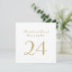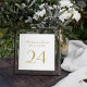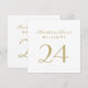 Delicate gold calligraphy and refined script on a clean white background create a quietly elegant square-shaped wedding table number card. The couple's names are displayed in flowing letterforms for a timeless, understated monogram design. The couple's names, date, and table number are easy to personalize. Each table number must be individually personalized and added to the cart one at a time.