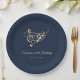This editable elegant birthday paper plate features a wavy stave with music notes and a treble clef in faux gold on a blue background, complemented by modern script typography. Perfect for adult birthday parties, musical events and music lovers. Customize it with your own text and make use of the editing tool to adjust the font size and placement. Should you require any help with customization, please feel free to message us on Zazzle.