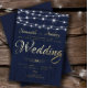 Simple and modern wedding invitation template. Gold calligraphy on a Navy Blue rustic background with pretty string lights decorating the top of the design. Also includes RSVP details and is easy to customize with your own details.