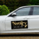 Elegant, trendy business car magnet for notary loan signing agent featuring faux foil gold handwritten calligraphy script ''notary'' on a black background. Personalize with your details.
