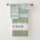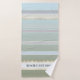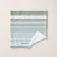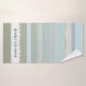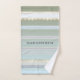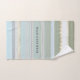 A beautiful striped bathroom towel set in pastel green blue and grey beach colors. The waves have a gold stylized design (printed). You can use the texts for a rental purpose if you like, or any other use. It is also possible to delete it if you do not need it. Beautiful for a beach house or coastal living space as well as a pastel colored design bathroom.
