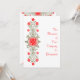 Elegant custom invitations with red script letters and a vintage printers mark etching with a decorated shield and a floral design of daisies and curling leaves in red and golds, restored from an antique manuscript.
