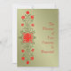 Elegant custom invitations with red and golden script letters and a vintage etching with a decorated shield and a floral design of daisies and curling leaves in red and golds, on a golden background.