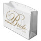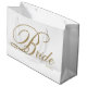 Large Bride gift bag. Elegant gold script Bride on a white background with wedding date in classic block text at bottom right. The wedding date can be removed by clearing the text field, or changed to add bride and groom initials.
