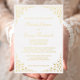 This elegant vintage-inspired formal wedding invitation features the text in real gold foil script and serif fonts, framed by a delicate vintage gold vine motif.