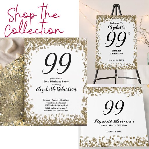 This pretty and elegant gold surprise 99th birthday invitation for her is perfect for a nice party and will set a celebratory tone. The text is larger so you won't need to squint to see it!