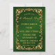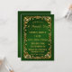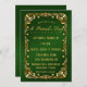 Classy holiday invitations with a brushed-gold look ornate border with shamrocks on a dark green gradient background.
