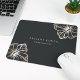 Island chic personalized mousepad for your business or home office features two lines of custom text in classic white lettering, on a soft black background adorned with two tropical hibiscus flower illustrations in faux gold foil for a beach glam look.