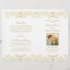 Elegant white vintage inspired wedding ceremony programs feature an ornate decorative border design with a metallic champagne gold shimmer appearance. Personalize the custom photo and text for your bridal party, ceremony information, and thank you message. Note: these text weight paper programs arrive flat and require folding to assemble.