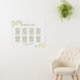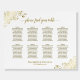 This beautiful 8 table wedding seating chart is simple, stylish, sophisticated, and chic. It features a lovely gold and white design with an elegant script calligraphy title, and lacy golden curls and swirls in the corners. There is space for 80 names at 10 seats per table, with the names of the couple and wedding date displayed below.
