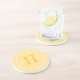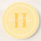 An elegant sandstone coaster featuring a golden yellow serif initial and custom family name in script, framed by a white circle on a warm yellow background. The sunny, cheerful palette brings a bright, welcoming energy to any tabletop. A fun personalized gift for housewarmings, birthdays, or summer entertaining. All text is fully customizable.