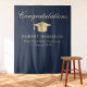 Elegant blue graduation party welcome tapestry and photo prop featuring a gold grad cap, "Congratulations" in a classic calligraphy script and the graduate's name, school and class year in modern serif typography.