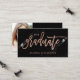 Personalize these stylish and trendy graduation insert cards with your personal photo, plus all of your contact information and social media links. The front of the card features the word "graduate" in modern faux rose gold typography on a black marble look background.