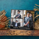 Elegant graduation keepsake black photo plaque to celebrate your graduate featuring a three picture collage and his or her name, class year and school in elegant modern white typography.