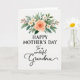 This card features a graceful arch of flowers across the top, set against a bright white background that keeps the details airy and soft. A large peach-colored bloom sits near the center like a garden rose, surrounded by smaller creamy white, star-shaped flowers with pale yellow centers and slender deep-green leaves. Tiny blush-pink berry clusters tuck into the greenery, adding a sweet, friendly touch that feels like a gentle hug ❤️. Centered beneath the floral arch, the main line “HAPPY MOTHER’S DAY” is written in uppercase serif-style lettering in a dark gray tone. Below that, “To a wonderful Grandma” appears in a flowing cursive-style line, also centered, in a slightly lighter gray that feels tender and close. The mix of structured uppercase text and the softer cursive line creates a warm contrast, like a respectful greeting followed by an affectionate aside 🌼. The top garland curves evenly from left to right, with the peach bloom slightly forward and the small white flowers and pink berries filling the spaces between the leaves.