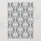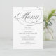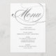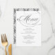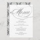 Elegant and formal white wedding dinner menu cards feature dark charcoal gray calligraphy script and damask pattern on the back of the card.