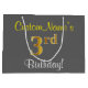 This simple, elegant birthday gift bag design features a personalized message like "CustomName’s 3rd Birthday!" (with the "3rd" having a faux/imitation gold-like coloring look) on a gray colored background. The name is in script-like, yellow-colored text, and can be personalized. A personalised birthday gift bag like this could perhaps be used when giving a present or gift to somebody who is celebrating their third birthday. [~Z0000261]