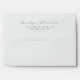 This wedding envelope features a clean, minimalist design with an elegant cursive script for names and a simple serif font for the address details. The layout is centered on a plain white background, creating a balanced and sophisticated look. With its dark gray or soft black color palette, it offers a subtle contrast that enhances readability without overwhelming the eye. Perfect for formal invitations, this design exudes calmness and timelessness, making it ideal for couples seeking a refined and understated aesthetic.