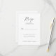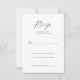 This elegant wedding RSVP card features a minimalist design with ample white space, creating a clean and sophisticated look. The layout includes a prominent cursive "RSVP" at the top, followed by a formal serif font for the response instructions. Personalization options are seamlessly integrated, allowing for a name and number of attendees to be added. The restrained color palette of dark gray or black on crisp white enhances its classic style, making it perfect for conveying refinement and simplicity at your special event.