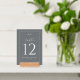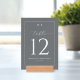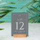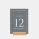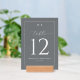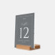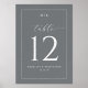 This elegant wedding table card features a minimalist design with a muted gray background and crisp white text, creating a sophisticated and modern look. The layout is vertically oriented, showcasing the table number "12" in bold serif typography as the focal point, complemented by an elegant cursive script for the word "table." Customizable placeholders allow for personalization with names and dates, making it perfect for adding a touch of refinement to your event. The clean lines and balanced spacing convey a timeless feel, ideal for formal celebrations seeking a chic and understated aesthetic.