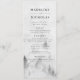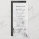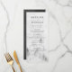 Elegant custom wedding menu card featuring a forest of misty gray watercolor pine trees at the top with your name, wedding date, and menu details shown below. The menu reverses to a charcoal gray watercolor background with space for text and photos. Designed to coordinate with our Elegant Winter Forest wedding collection.