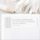 This return address label features a minimalist and modern design with a clean layout that emphasizes elegance and simplicity. The grayscale color palette, consisting of black text on a white background, enhances readability while maintaining a sophisticated look. Vertical lines add subtle texture to the left side, creating depth without cluttering the overall appearance. The typography is formal yet contemporary, using a serif font for a touch of tradition, making it ideal for personal events like weddings or significant celebrations. Its understated style conveys professionalism and versatility, perfect for those seeking a polished presentation.