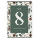 This elegant wedding table card features a modern yet rustic design with a central focus on the number "8" in bold, white typography against a deep forest green background. The surrounding botanical illustrations of leaves and pinecones in muted earth tones create a harmonious frame, enhancing the natural theme. The layout is clean and symmetrical, with ample negative space ensuring clarity and readability. Perfect for adding a touch of sophistication to your wedding event, this card combines contemporary style with traditional nature motifs, evoking warmth and refinement.