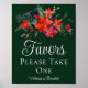 This gorgeous Christmas wedding favors sign features a beautiful watercolor of red poinsettia flowers and pine leaves for the holidays. Elegant winter wedding poster in green for a holiday event. Pretty poinsettia floral reception decor. Please take a favor.