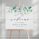 This wedding welcome sign features painted watercolor eucalyptus, botanical green, and light blue leaves with a modern swirl script.