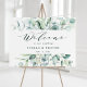 This wedding welcome sign features painted watercolor eucalyptus, botanical green, and light blue leaves with modern calligraphy.