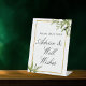 This elegant green botanical wedding advice and well wishes pedestal sign is framed with beautiful green watercolor leaves and olive vines and a gold rectangle frame. This lovely greenery and dark color scheme is perfect for an upscale autumn event for a classy bride in the fall.