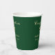 Elegant green graduation party paper cups featuring a gold grad cap, "Congratulations" in a classic script and the graduate's name, school and class year in modern typography.