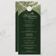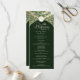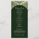 This wedding program features a rich green background adorned with ornate golden damask flourishes, creating a luxurious and timeless style. A decorative crest sits at the top, while the central layout highlights the couple’s names and all wedding service details in a refined and organized format. The elegant pairing of green and gold brings a sophisticated and regal look, making this program card a perfect choice for formal, traditional, and evening weddings.