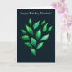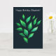 Elegant nature lover personalized birthday card with a mixed media ink and digital painting of abstract green leaves with light green veins over dark green, almost black, customizable background.