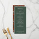 This elegant wedding menu features a deep forest green background with crisp, white text arranged in a clean and minimalist layout. The design utilizes a combination of serif and sans-serif fonts to create a sophisticated look, emphasizing clarity and readability. Each section is neatly divided by horizontal lines, enhancing the organized presentation of the meal options. Perfect for formal occasions, this template exudes refinement and simplicity, making it an ideal choice for couples seeking a classic yet modern aesthetic for their special day.