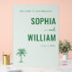 This elegant wedding sign features a minimalist design with a light green background and a single palm tree illustration, creating a tropical theme. The layout is clean and balanced, showcasing bold serif fonts for the names and a cursive script for "and," enhancing its sophisticated look. Customizable text allows you to personalize it for your special day, making it perfect for welcoming guests at your wedding celebration. The overall mood is serene and inviting, ideal for setting a tranquil atmosphere on your big day.