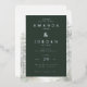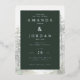 This elegant wedding invitation features a sophisticated dark green background with subtle marbled textures framing the design, creating an inviting contrast. The layout is clean and modern, utilizing serif fonts to emphasize key details like the couple's names and event information. Delicate illustrations of pine trees add a natural touch, enhancing the overall theme of classic elegance blended with contemporary minimalism. Perfect for couples seeking a refined yet warm atmosphere, this invitation sets the tone for an intimate celebration.
